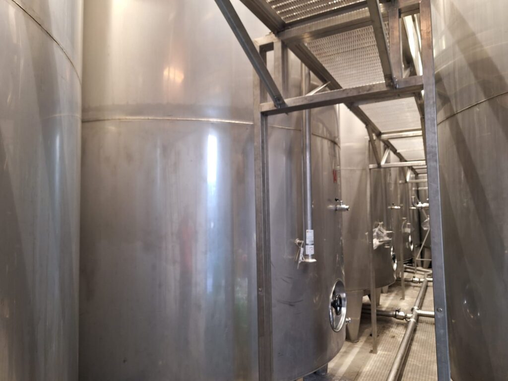 N°33 Serbatoi Inox da Hl.220 , poggianti su gambe con fondo conico, motoagitatore, valvola presa campione, specola di visione, tubazione di carico, valvola per asta livello, passerella e N°1 Scala Inox.